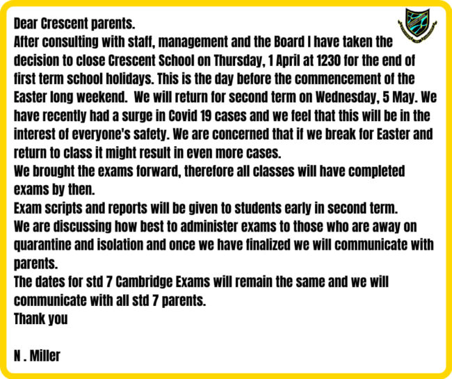 Dear Crescent parents. After consulting with staff, management and the Board I have taken the decision to close…